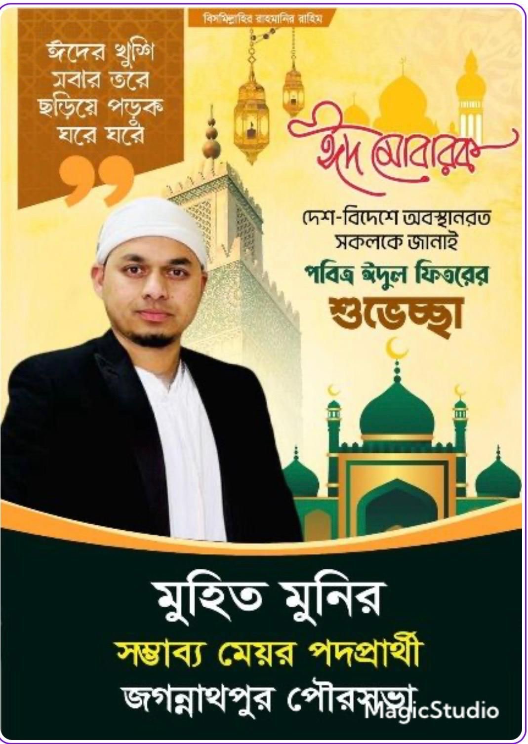 জগন্নাথপুর পৌরসভা নির্বাচনে সম্ভাব্য মেয়র পদপ্রার্থী যুক্তরাজ্য প্রবাসী আব্দুল মুহিত মুনির দেশ-বিদেশে অবস্থানরত সকল পৌরবাসীকে পবিত্র ঈদুল ফিতরের শুভেচ্ছা জানিয়েছেন।